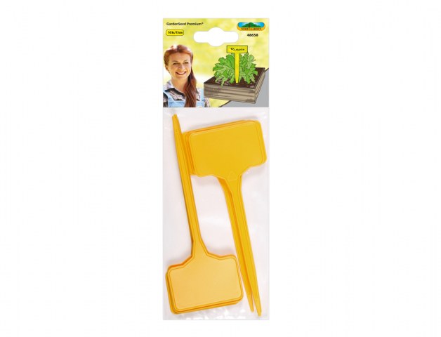 Žlutá zapisovací jmenovka pro označení rostlin. Celková délka: 15 cm, šířka a výška popisovatelné plochy: 5,5 x 3,5 cm. V balení je 10 kusů.