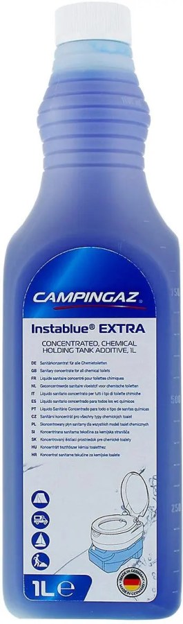 Sanitární prostředek WC INSTABLUE EXTRA nezbytný při používání chemické toalety - musí se přidat do spodní odpadní nádrže, kde ničí bakterie, viry a potlačuje zápach.